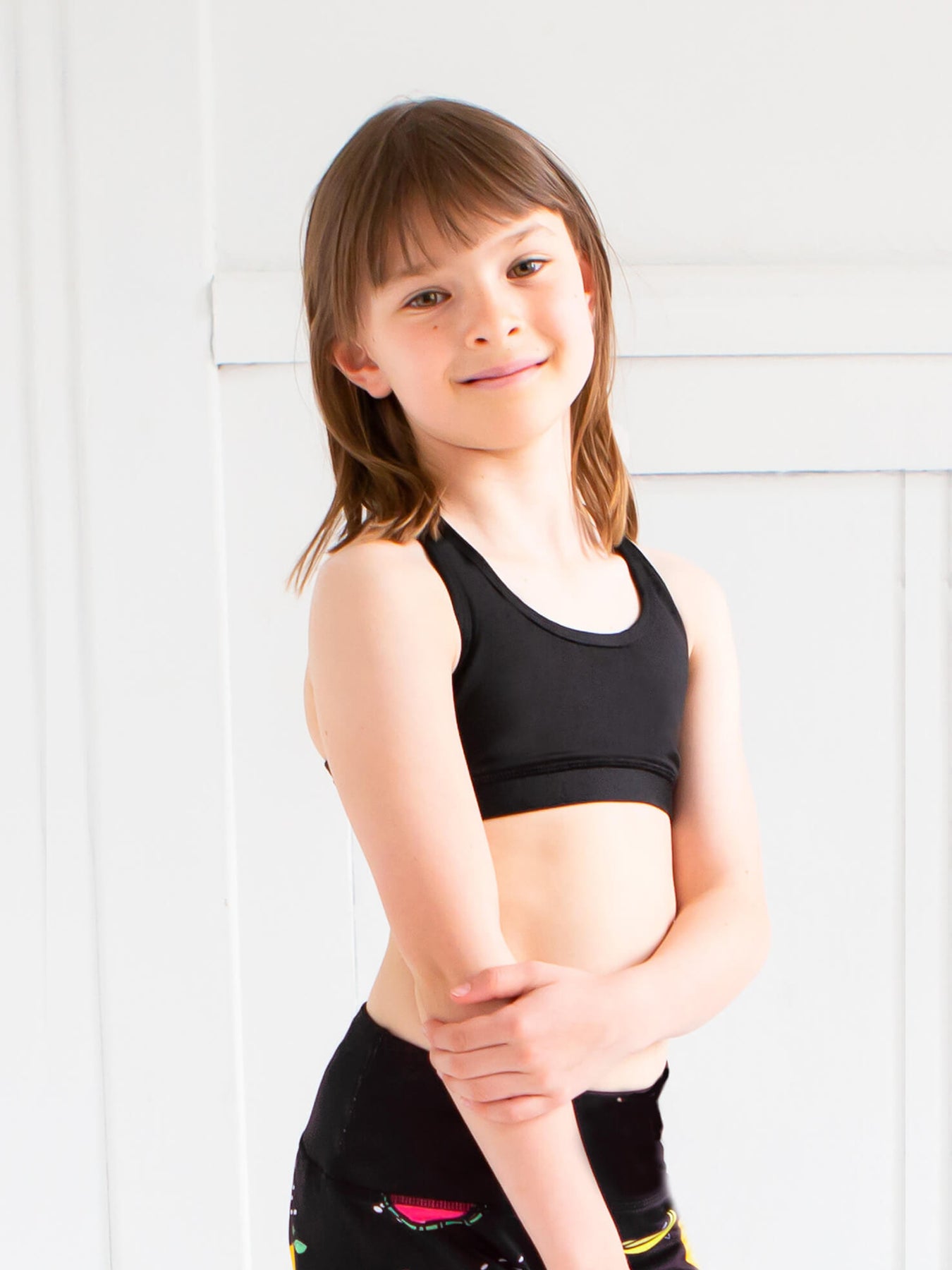 Play with confidence in our activewear sports bra. Made with stretchy performance fabric, our solid black half-top will give your girl coverage and comfort.
