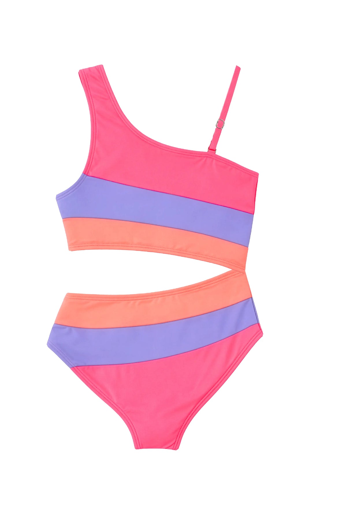 This Vivi one-piece swimsuit showcases a vibrant colorblock pattern in hot pink, lavender, and peach, highlighted by a stylish side cutout, a single shoulder, and an adjustable strap for the perfect fit.