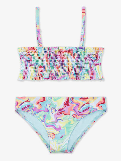 UPF 50+ girls bikinis and two piece swimsuits in a variety of colors and prints.