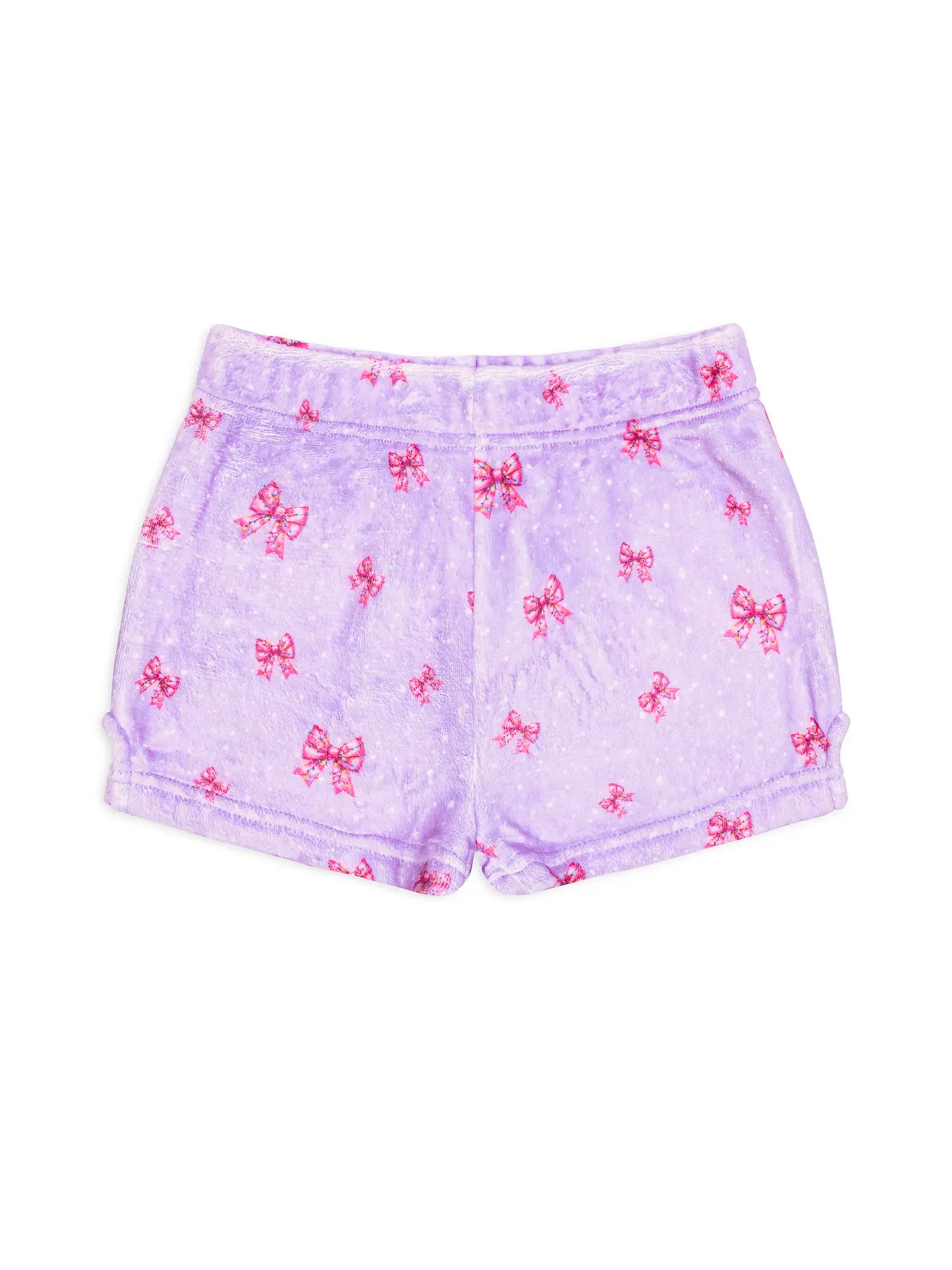 Introducing the ultimate pair in comfort and style: our luxurious plush loungewear shorts, perfect for every girl's wardrobe. These holday bow girls' shorts feature are perfect for holiday gifting and lounging all day. Crafted from 100% polyester and brushed on both sides, these girls' pajama shorts offer unparalleled coziness, ensuring they feel just as soft on the inside as they do on the outside.
