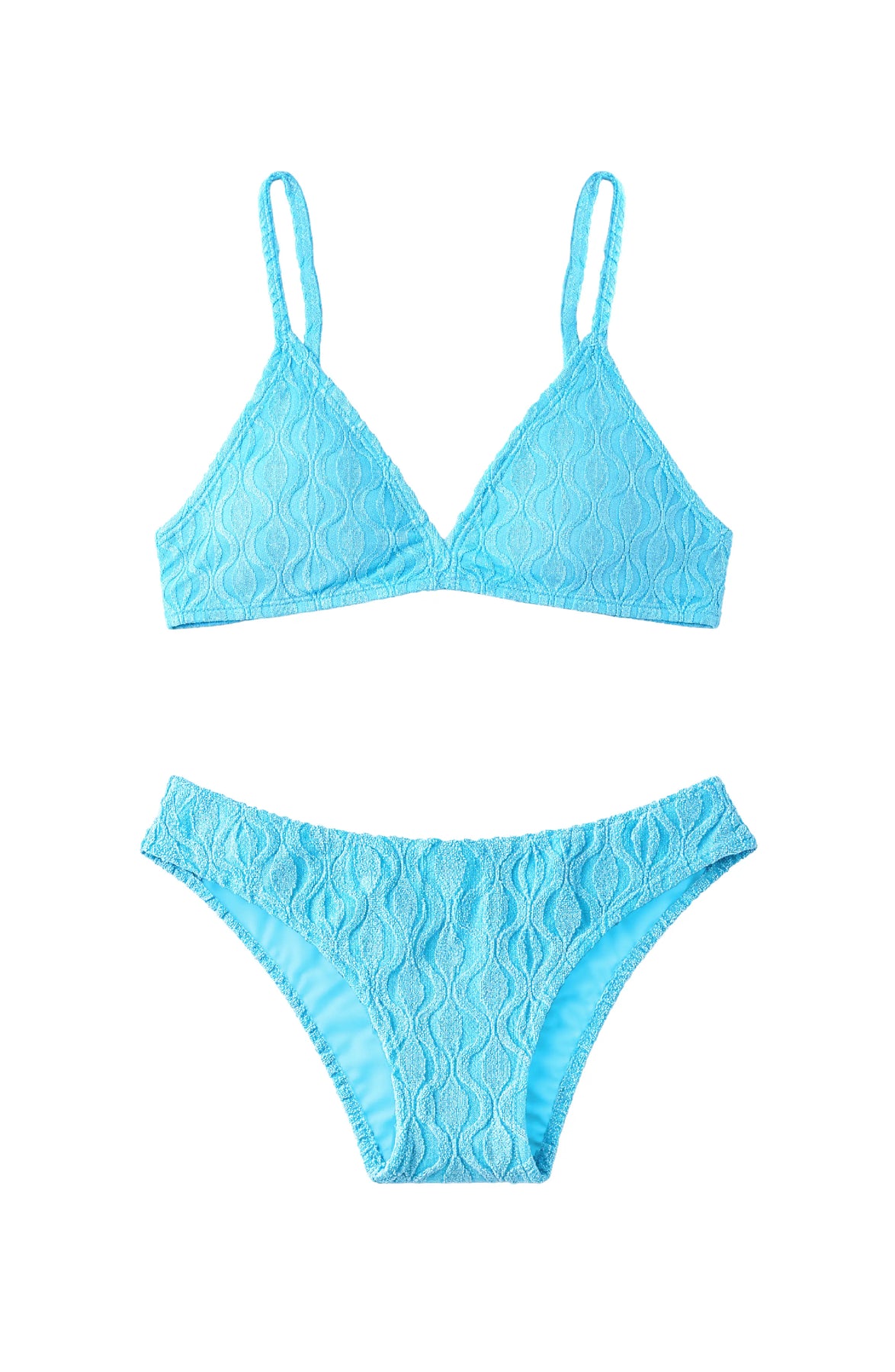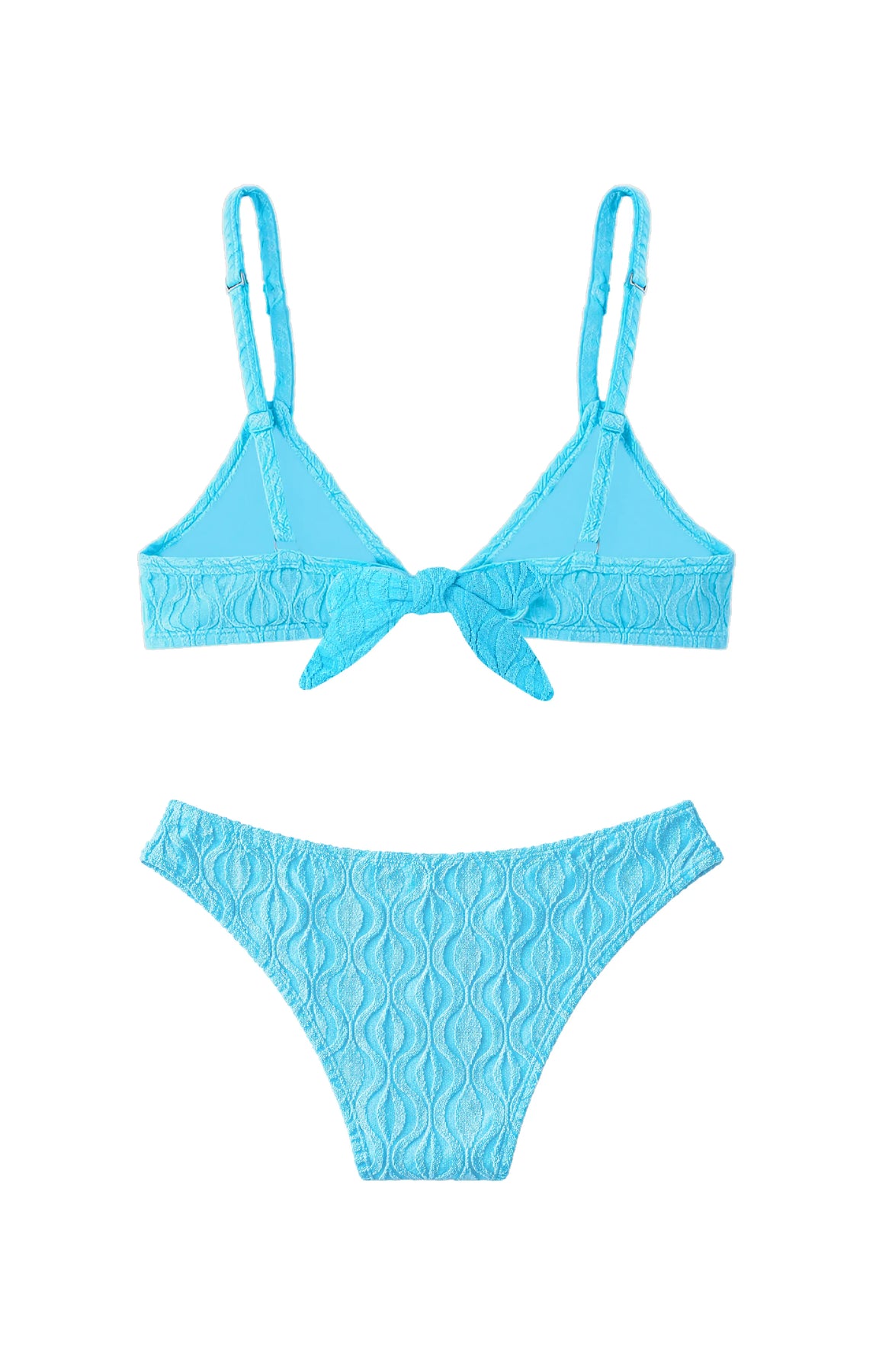Dive into summer fun with this Riley turquoise triangle bikini featuring a textured wave pattern in a comfy terry cloth.. Adjustable straps ensure the perfect fit, while the classic moderate coverage bottoms keep things comfy and cute.
