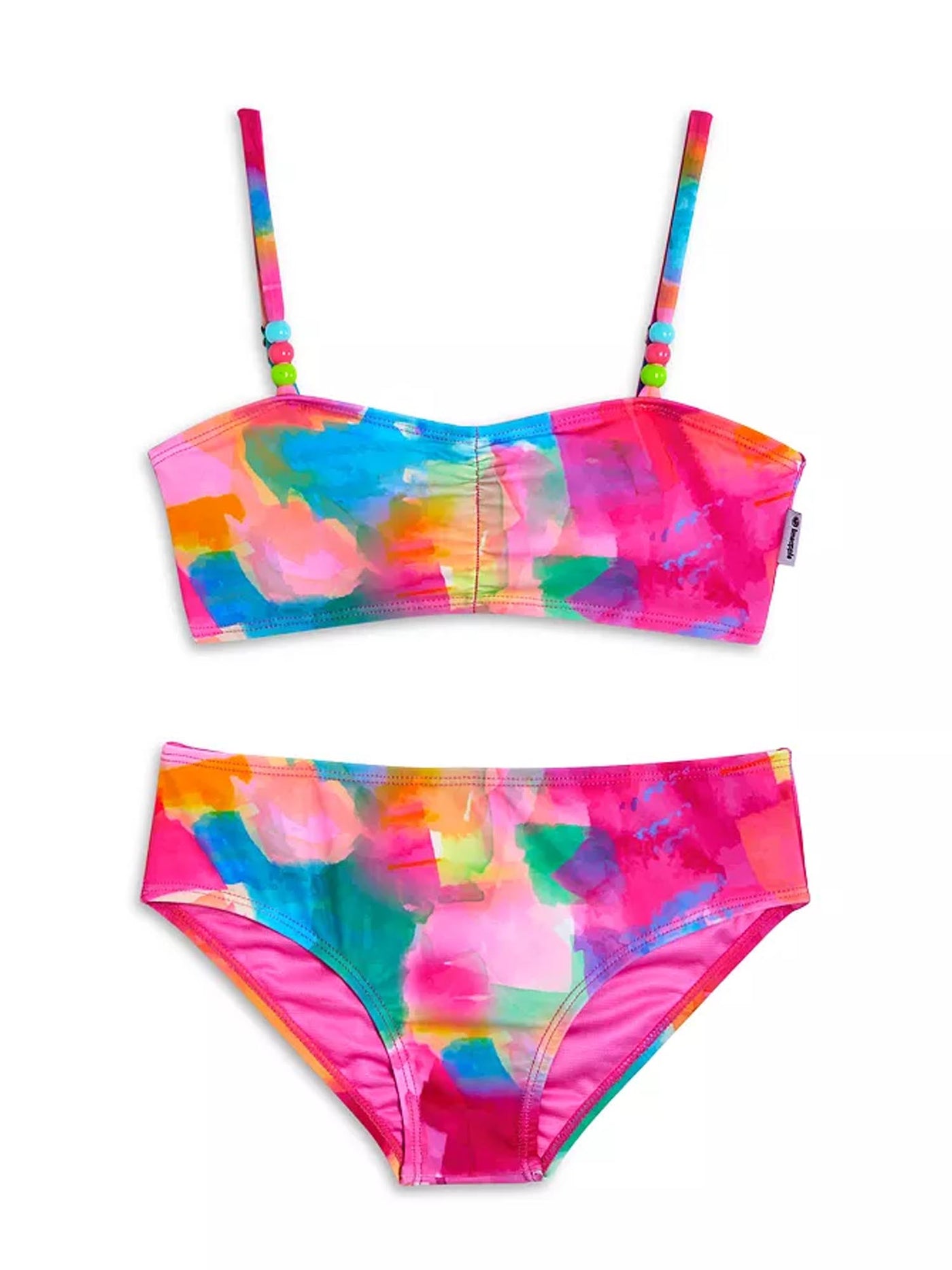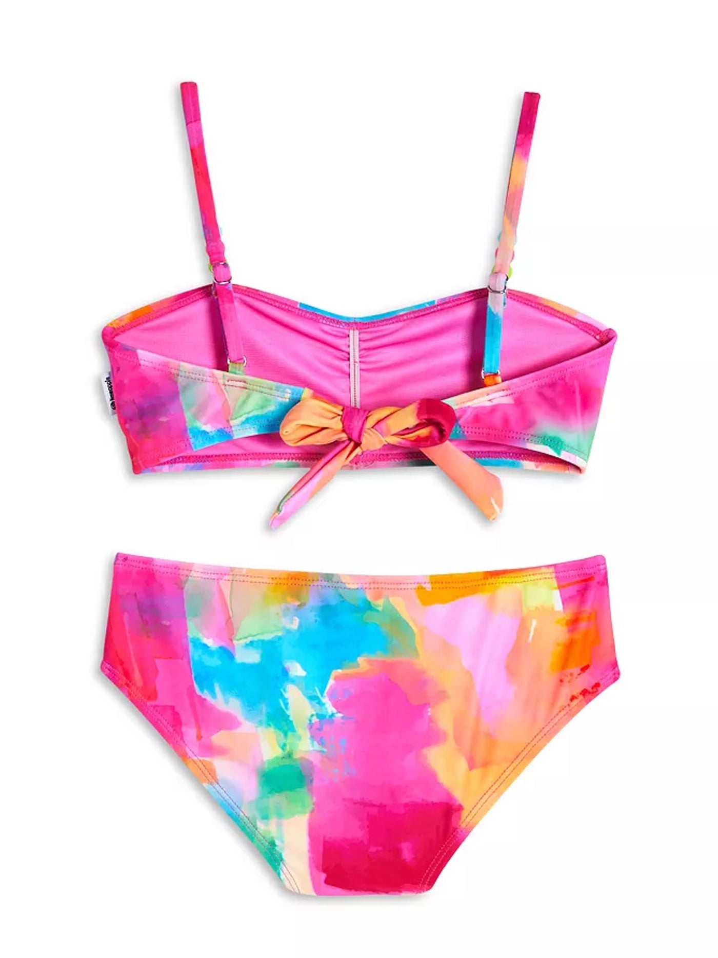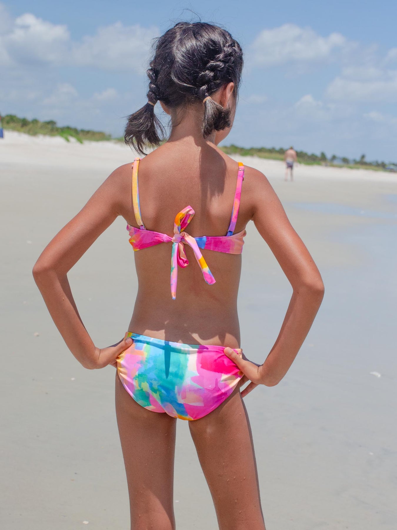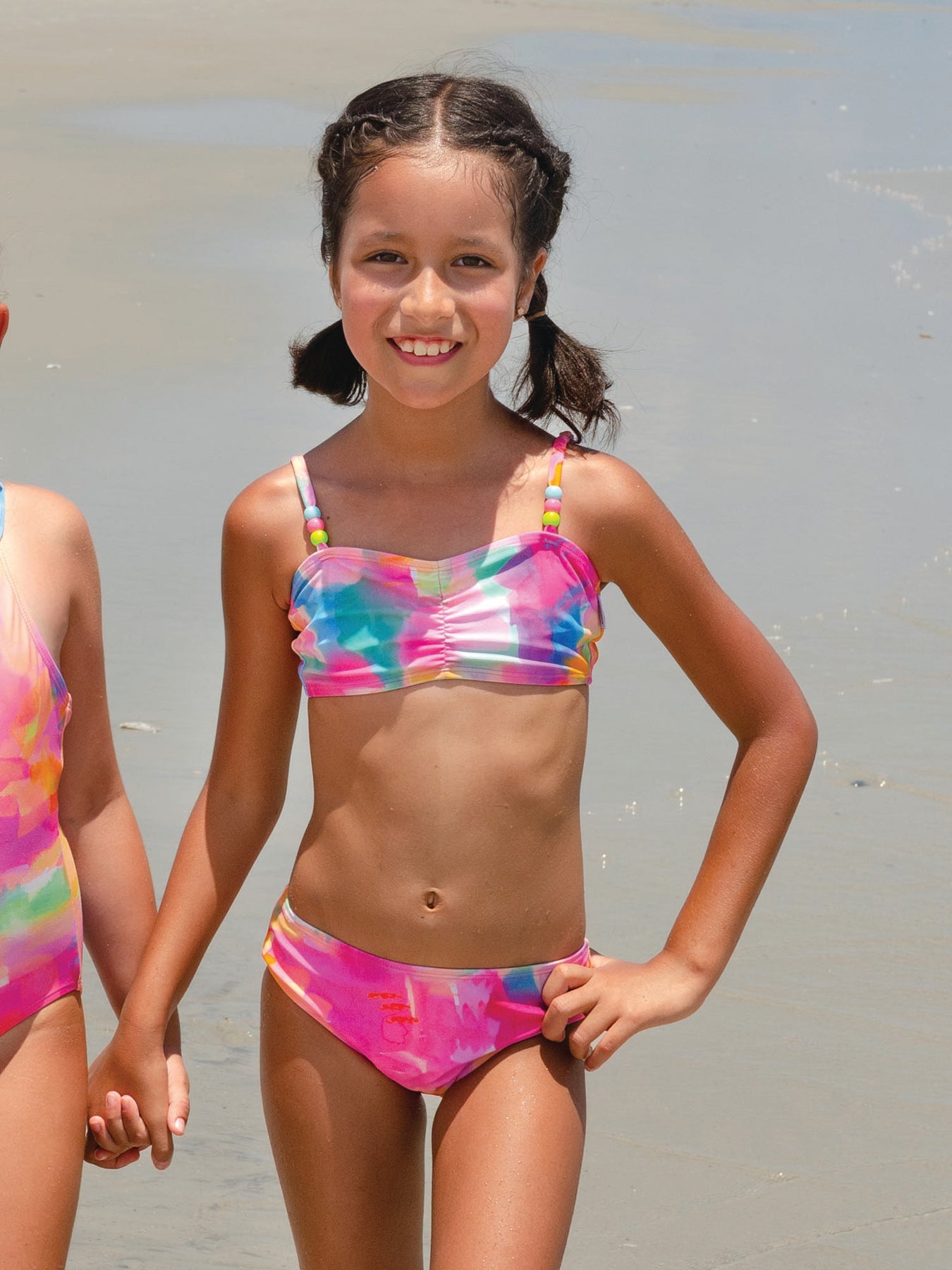 This multicolored gathered front bikini set is playful and eye-catching, while the gathering details add a touch of sweetness and femininity to the suit. This suit offers a comfortable and great fit that's perfect for active play and is built to withstand countless swims and summer adventures.