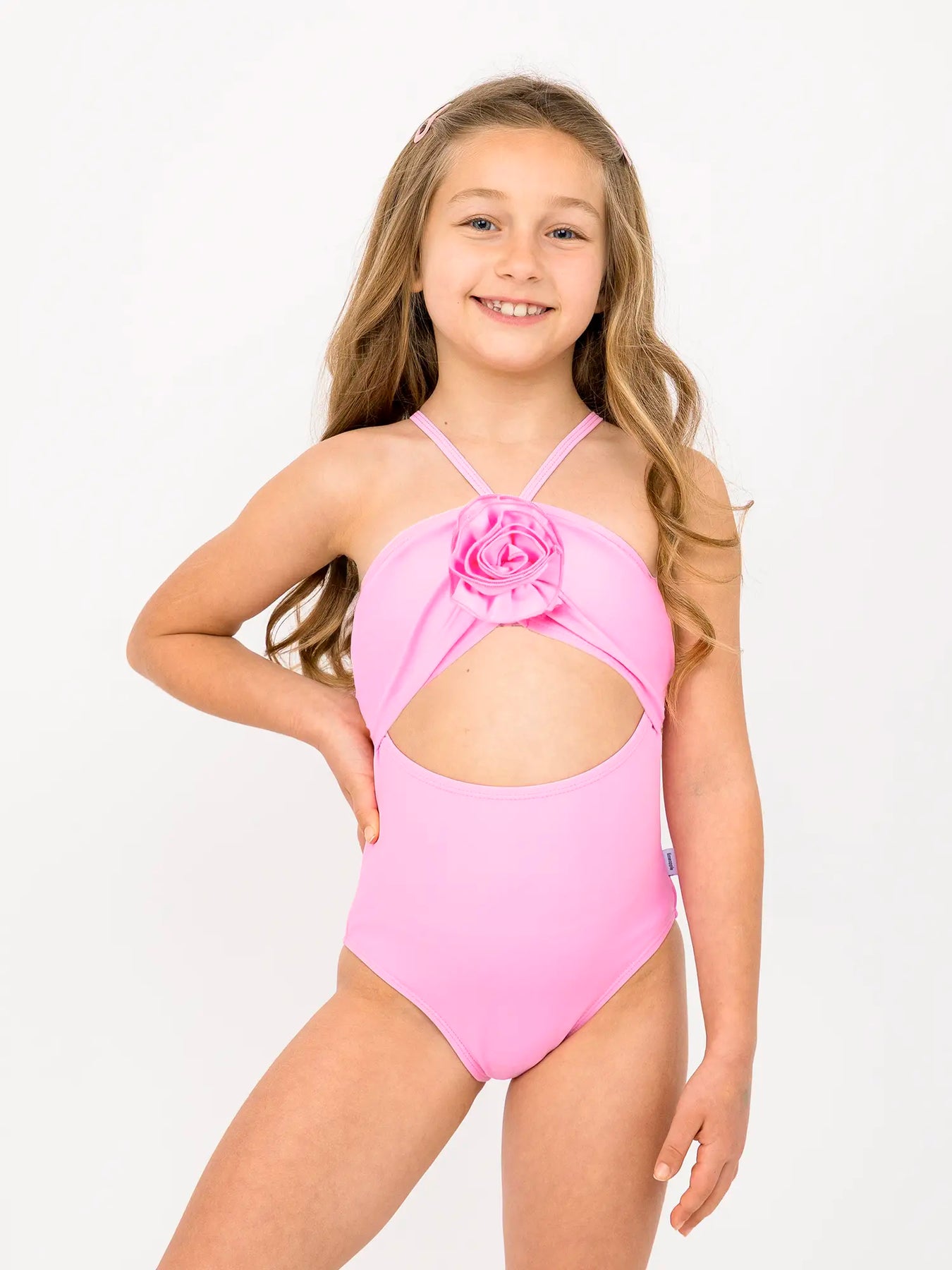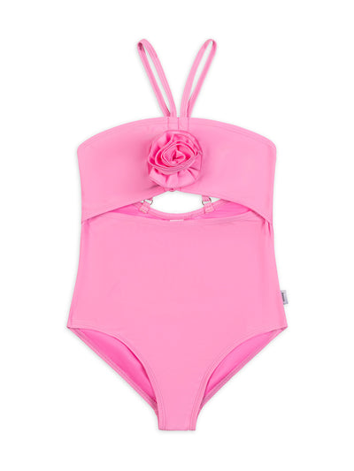 A charming one-piece that combines style and comfort for a chic beach or poolside look. This girls one piece swimsuit features adjustable halter straps with a fixed cute rosette detail and a cutout detail.