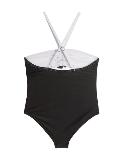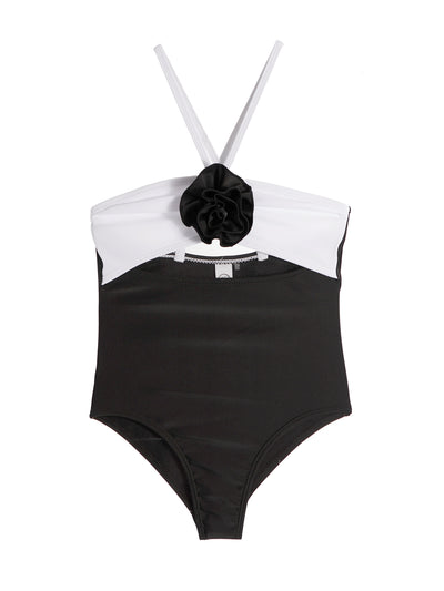 girls black and white halter one piece swimsuit with rosette