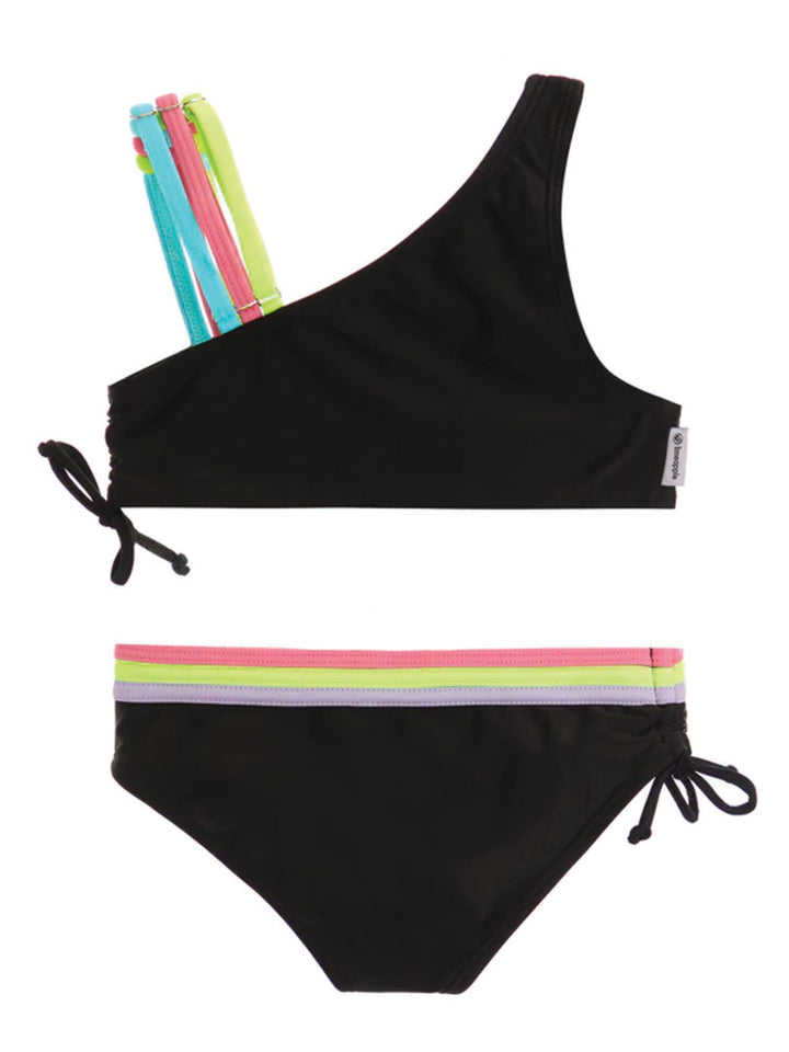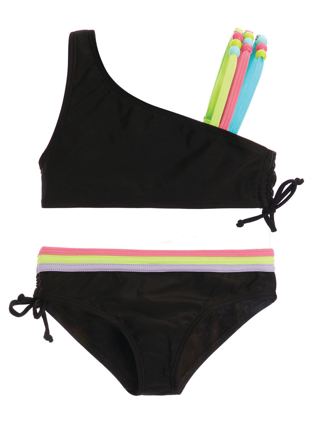 Add some excitement into your daughters summer wardrobe with our solid black asymmetrical bikini. This eye-catching two piece bikini set features two different straps adorned with beaded detail and colorful trim accents, adding a playful and vibrant touch to the beach look. Whether it is for lounging by the pool or catching waves at the beach, this bikini is sure to make a statement. Dive into summer fun and stand out from the crowd with this stylish and gorgeous bikini.