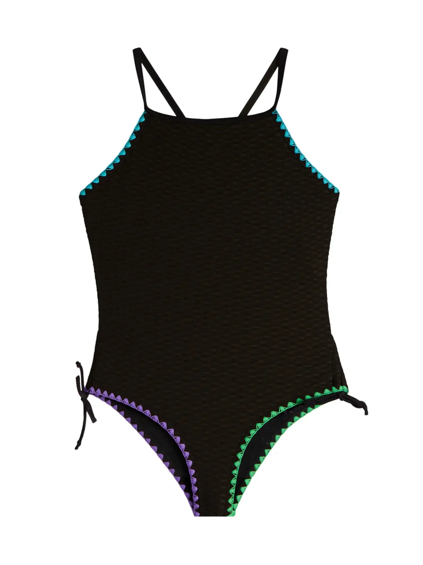 Designed with adjustable straps in a textured fabric, this girls one-piece swimsuit features embroidery trim detail that will have heads turning all summer long. The flattering fitted design is crafted from soft stretch fabric.