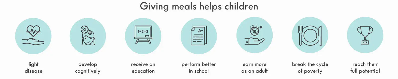 Our mission to donate meals to children in need goes beyond our fight to end childhood hunger. Good nutrition also helps break the cycle of poverty and fights disease and health issues. Balanced eating also shows improved cognitive development, concentration, social skills, and learning abilities.