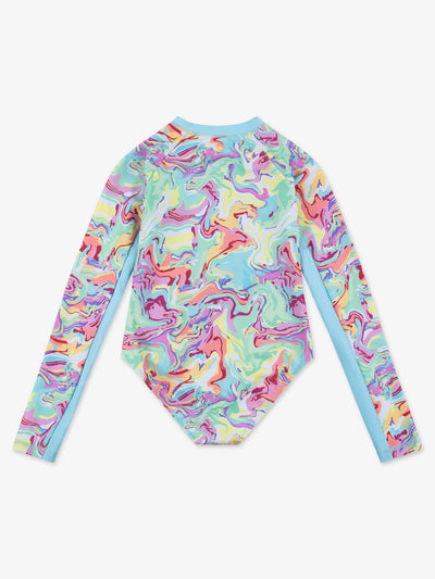 Your surf essential, this long sleeve one-piece swimsuit has a sporty silhouette with extra coverage and a retro-inspired marble all-over print.