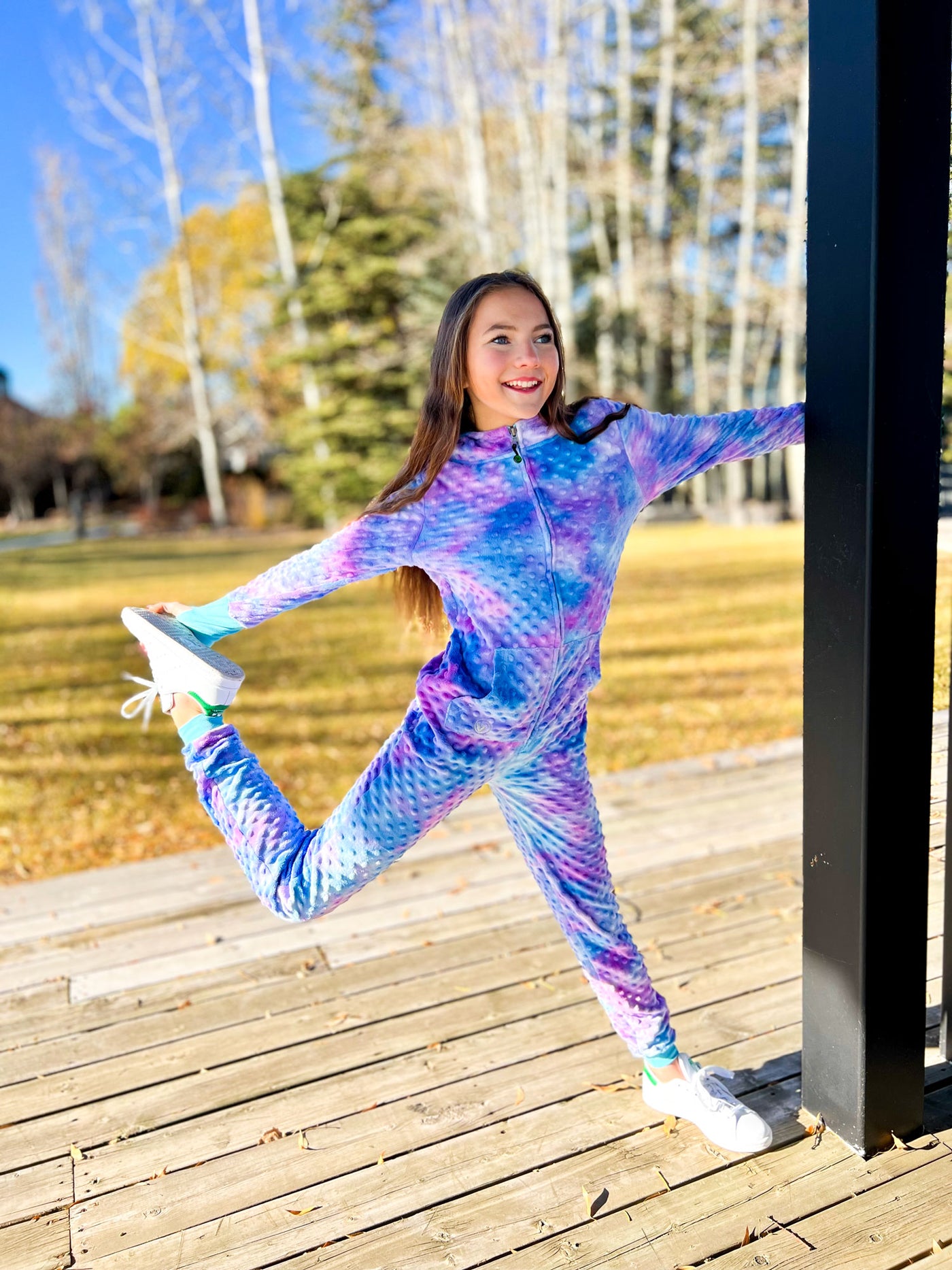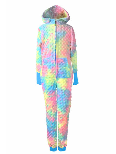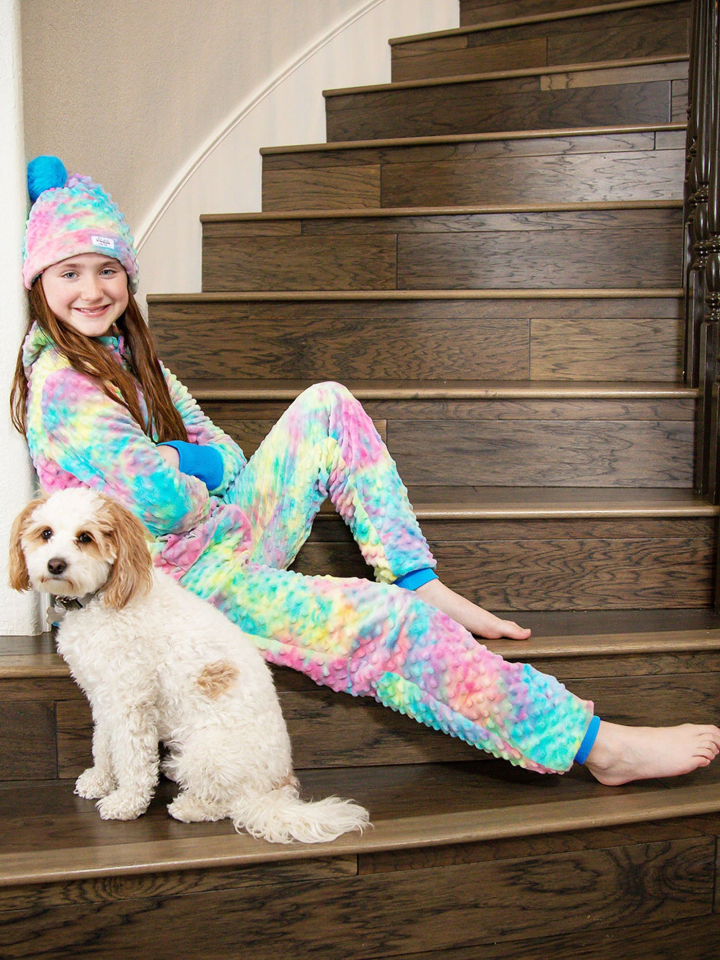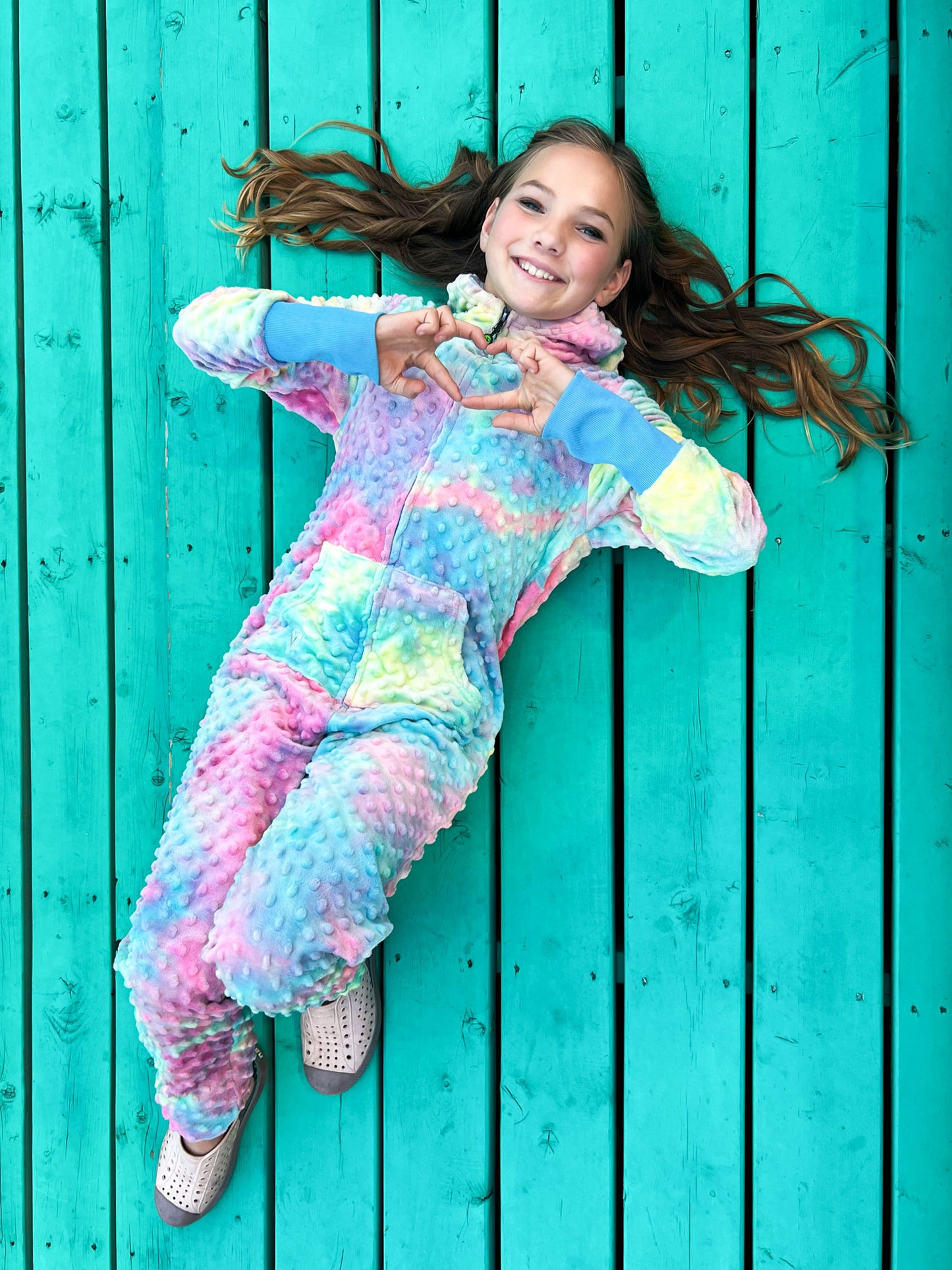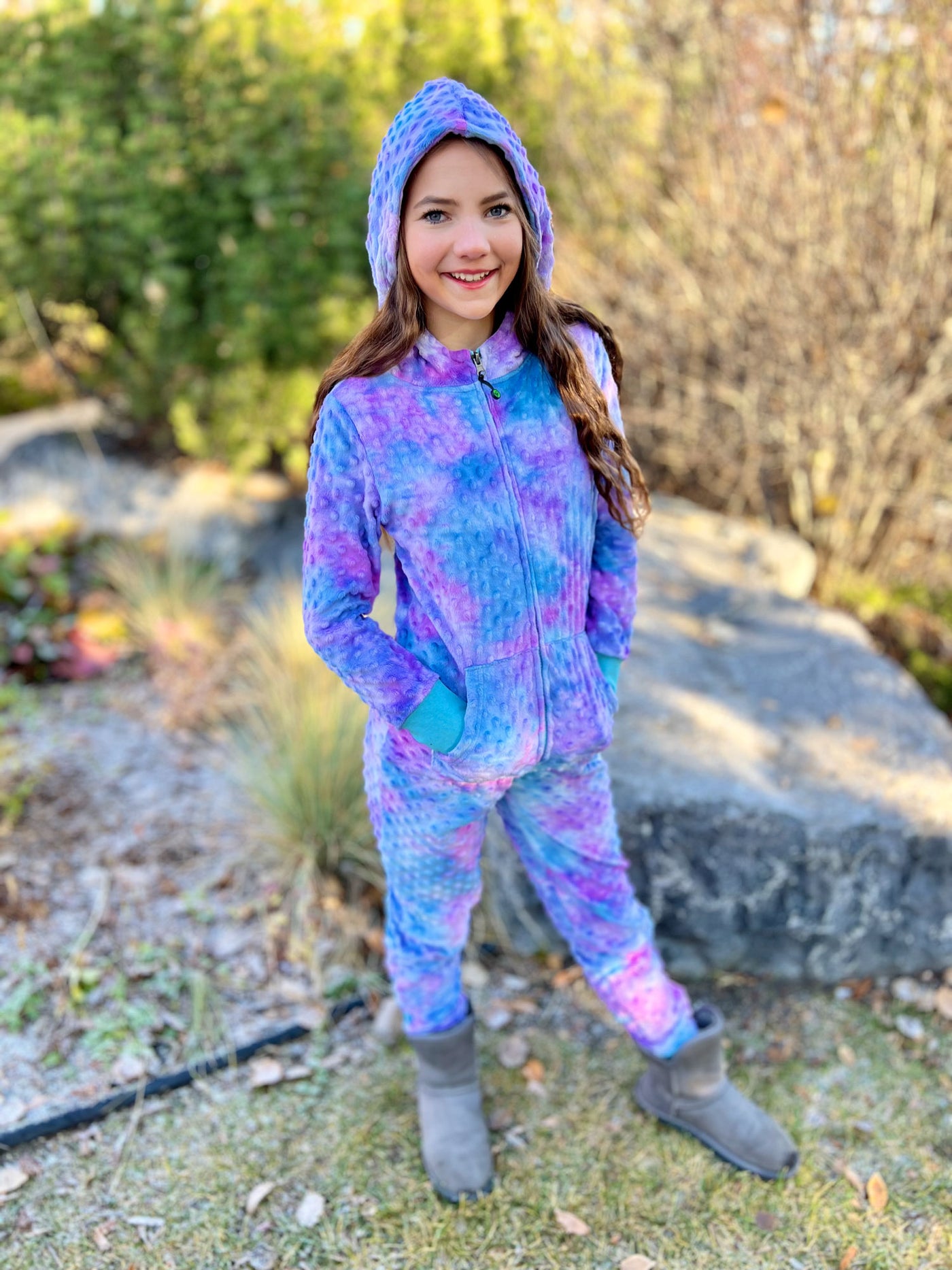 Our girls' one-piece pajamas are not only functional but also a statement of individuality. The hand-dyed tie-dye process guarantees that each piece is unique, with color variations adding to its charm. Ideal for tweens and teens, this onesie is specifically designed for those aged 10 to 12 and makes an excellent choice for sleepovers or lounging at home.