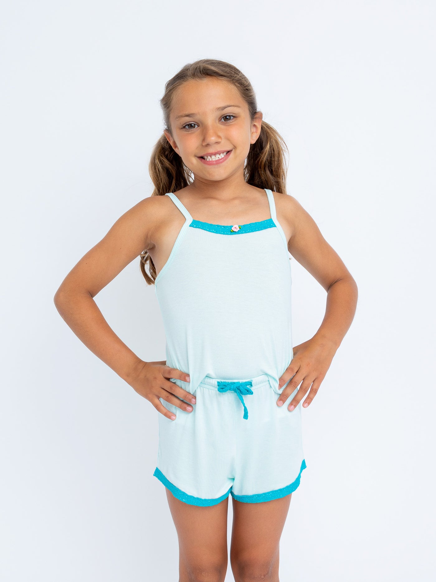 This light aqua cami pajama set is perfect for preteen and tween girls. Made with silky jersey fabric, it provides both comfort and style for a good night's sleep. With both a cami and shorts, this set offers breathability and a touch of femininity. Guaranteed to make bedtime that much sweeter.