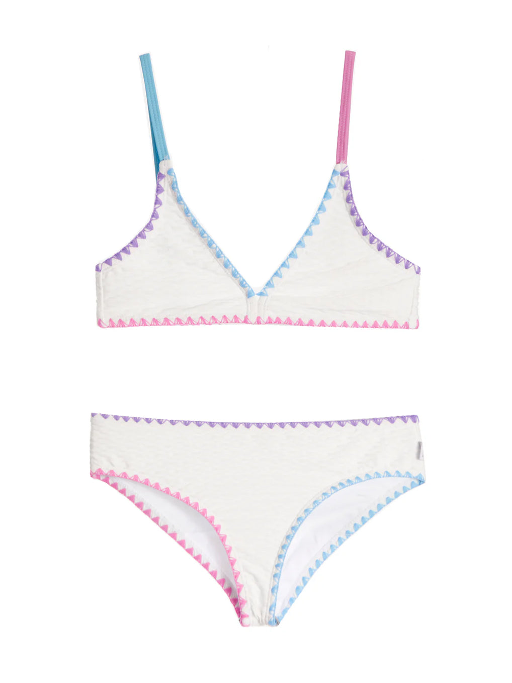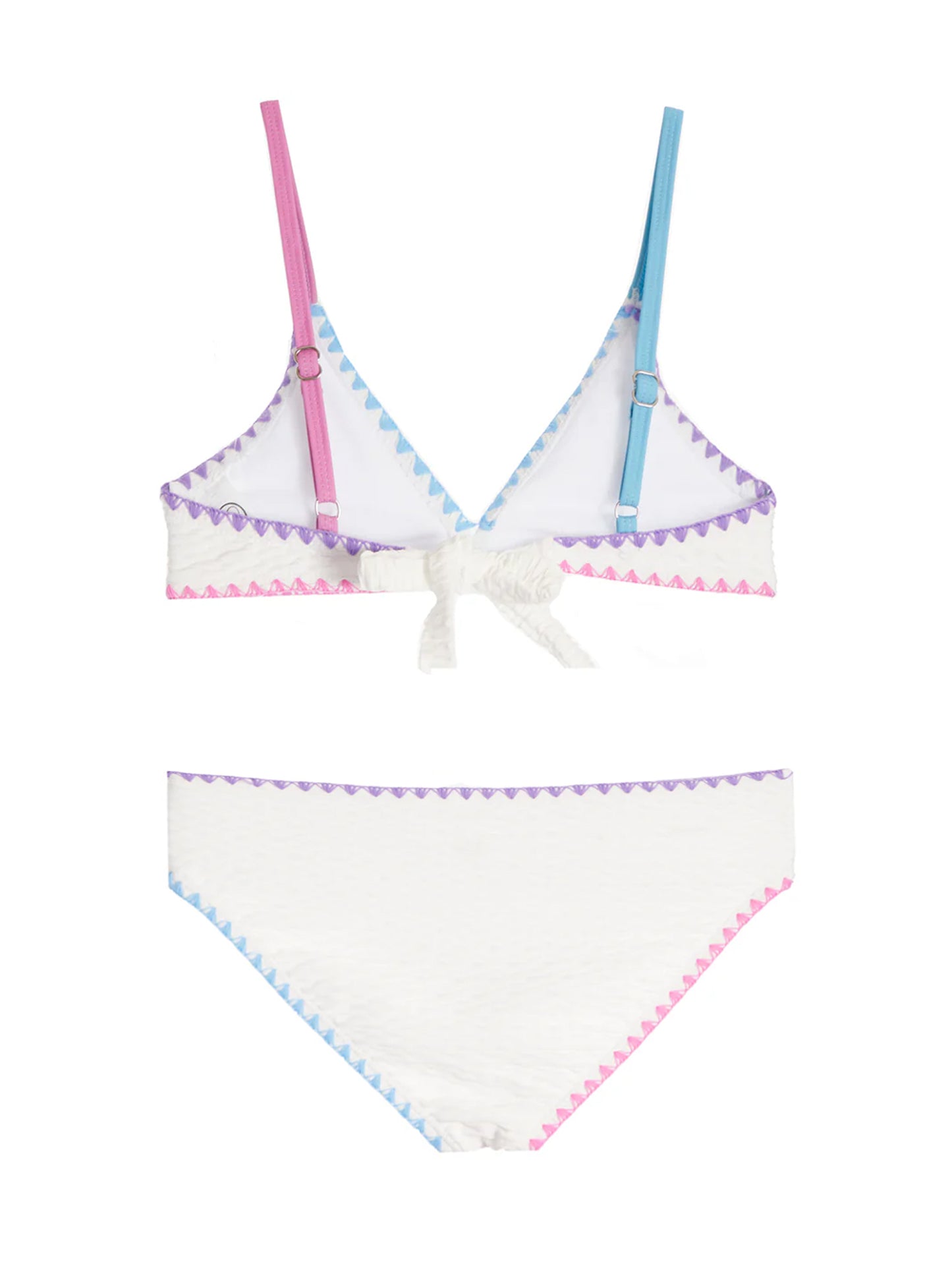 Prepare for a summer full of compliments with our Rani two piece swimsuit for girls, designed with colorful adjustable straps and embroidery trim detail. This white girls bikini features a textured fabric and is a classic silhouette.