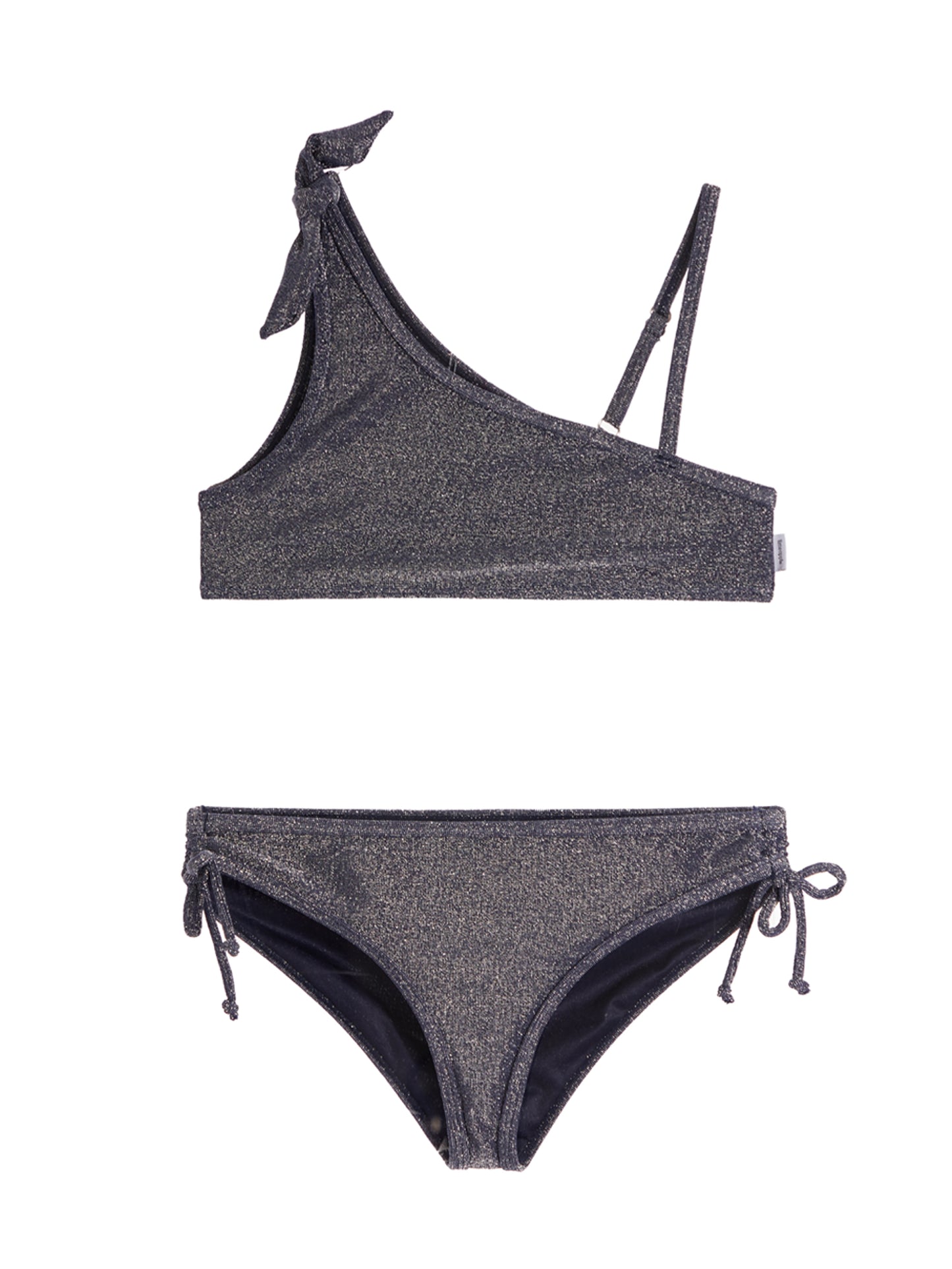 Add fun to your summer with this asymmetrical girls bikini with two different straps and bow detail in a glitter navy lurex fabric.